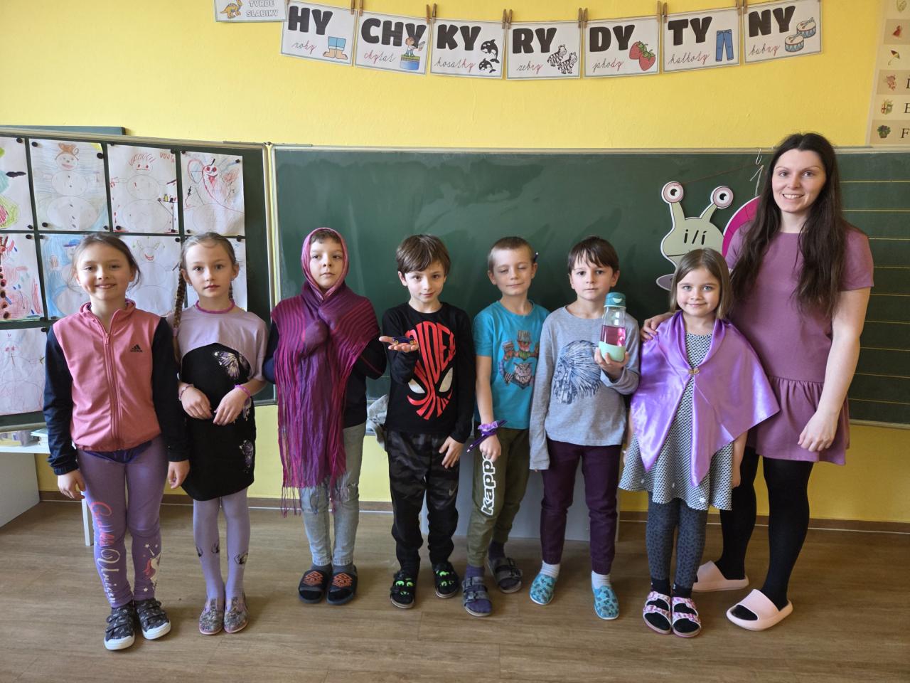 Do fialových barev se obléklo poměrné velké množství žáků, další zvolili doplňky nebo alespoň našli fialové předměty.